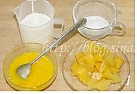 .80ML全脂淡奶和80ML淡奶油混合,细砂糖30克,吉士粉10克,蛋黄3个,黄桃150克切小丁;