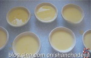 将挞水注入挞皮,8分满,烤箱预热200度,烤网倒数第二层,只开下管,25分钟左右,烤到挞皮酥脆、挞水凝固即可。