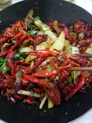 锅内倒入菜籽油,放入生姜片,蒜瓣,辣椒王,八角,香叶,麻椒炒出味。倒入清洗干净的龙虾翻炒,小火慢炒,大概3分钟这样出香味后,放入料酒,醋,在炒10分钟。放入盐,鸡精,味精,一勺糖,麻辣鲜,倒入清水与龙虾平行,大火煮至浓汤即可出锅