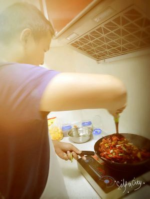 盖上锅盖转中小火,途中记得翻炒几次,直到差不多收汁