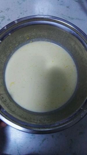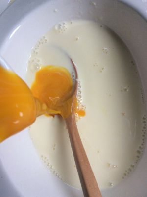 然后加入两个蛋黄液搅拌均匀(如果刚放微波炉叮的液体,必须等液体凉后再放蛋黄液喔)