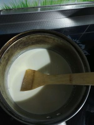 奶锅内加入牛奶,奶油,糖,炼乳,小火边加热边搅拌,直到起小泡关火