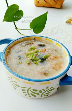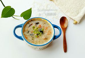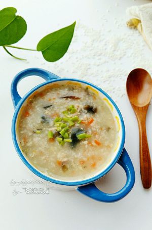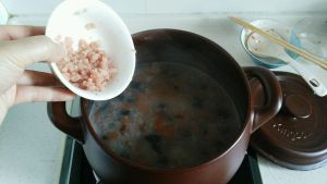 米粥煮烂胡,加入混合的肉丁,煮至5分钟。