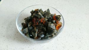 3.在这10分钟内,将皮蛋剥壳后切至碎粒,青菜洗好后切成碎条