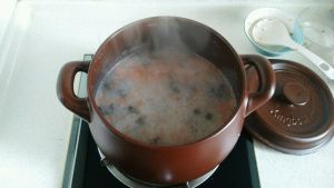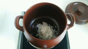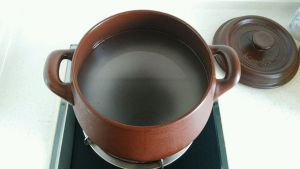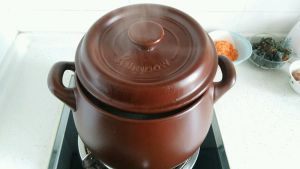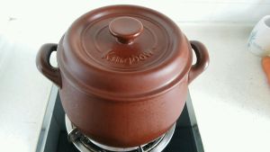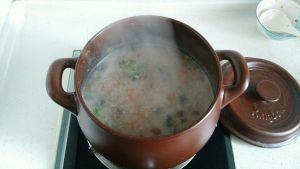 坤博砂锅中水开后,要打开锅盖留一点缝隙转小火煮,期间要多次打开锅盖用勺子搅拌,以免溢锅和糊底。