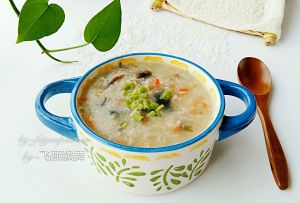 6.当粥煮得很浓稠的时候,关火,放入切碎的青菜,加盐,鸡精,胡椒粉搅拌均匀