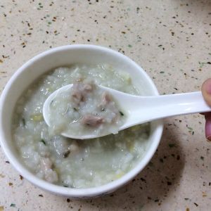 米煮的差不多快熟时加瘦肉,再加一个皮蛋,不停翻搅