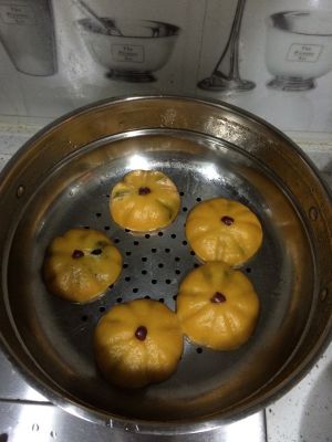 南瓜压成泥,加入糯米粉,揉光,喜甜可再加些白糖,搓成团,中间挖个洞,加入拌好的芝麻糖,搓圆,放到蒸锅里,用勺子柄压好条纹,将红枣剪成小块放到顶部,锅内加水,蒸15分钟,即可。