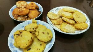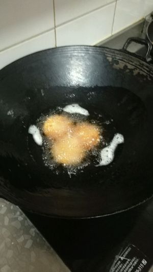 搅拌,也许很黏手, 用干糯米粉擦手,撮圆,轻轻拍扁。