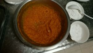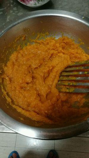 南瓜蒸熟后放入容器中,加入白糖压成糊状
