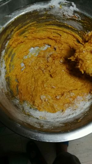 将糯米粉放入南瓜里面,分几次放,一次不要加太多,不需要添加冷水,面团揉的稍硬一些