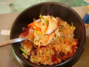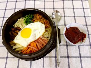 所有食材备好之后,在石锅内涂一层油,装入米饭和菜码,煎一枚鸡蛋摆在中间,加热石锅三到五分钟,到米饭边缘有微微的锅巴,浇上酱撒芝麻拌匀即可~