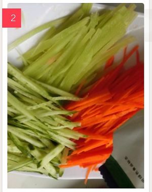 将木耳、胡萝卜、黄瓜、莴笋、香菇、黄瓜准备(如图所示,部分切丝)