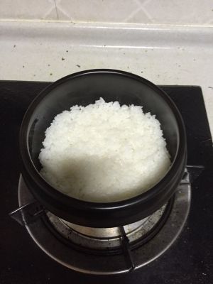 石锅放在火上加热,直至发出滋滋的声音、锅底米饭略焦,关火出锅。