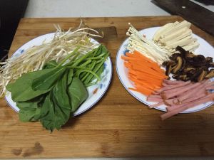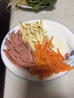 香菇、木耳,豆芽用开水煮熟,煮的时候放入少量的盐,以便入味。