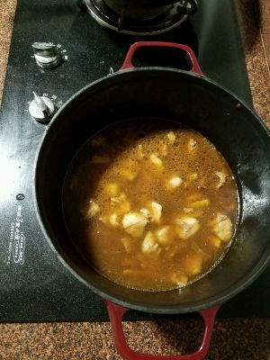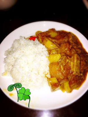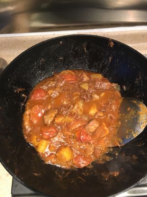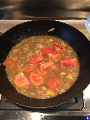 放入适量压牛肉剩的汤,加半碗水,煮沸后放入适量黄咖喱、土豆、番茄、番茄酱、淡奶油、肉桂粉、黑胡椒粉,不断翻搅,防止粘锅