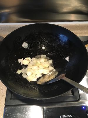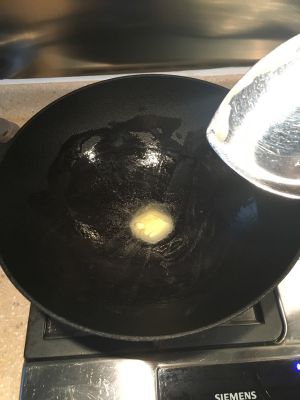 热锅放入黄油,用锅铲在锅底抹匀,防止炒菜粘锅