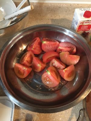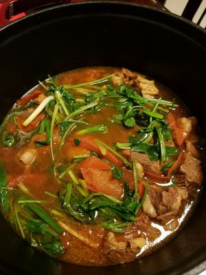 慢火炖45分钟后,打开盖放入切好的番茄,拌匀继续盖上盖子再继续炖45分钟。