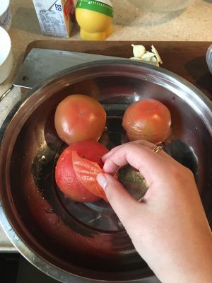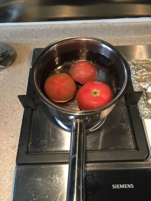 清水煮沸,将洗净的番茄放入沸水中、煮至表皮裂开