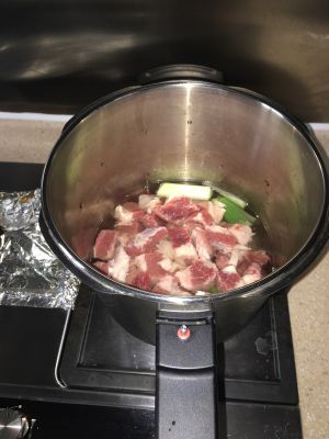 葱切段、姜切片、蒜切片,在高压锅中放入适量水,不用太多,撒白胡椒粉、肉桂粉,将肉压熟,牛肉汤不要丢掉,撇掉油盛出待用。
