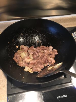 热锅下油,加入几颗冰糖,炒糖色(注意,此时只能中小火,避免火大,把糖炒苦)冰糖融化后,倒入牛腩,翻炒上色,加一点老抽,蚝油和适量生抽,继续翻炒