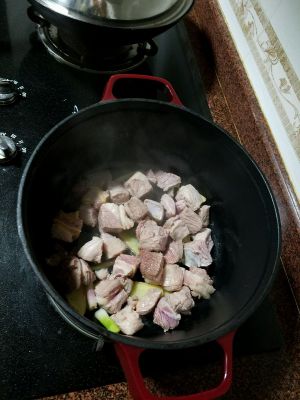 加清水,淹没牛腩,加入大葱,姜片,八角,开大火煮开,后,转小火,加锅盖,炖40分钟