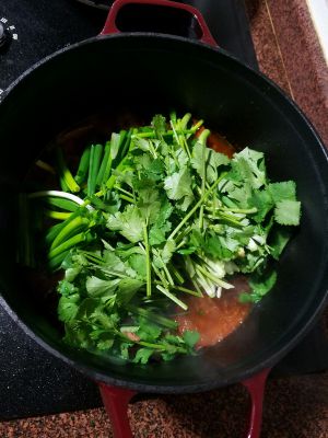 45分钟后,开盖放进葱段和香菜段,再盖上盖子用余热焖一下。