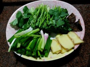 姜切片,葱和香菜切段,陈皮洗干净备用