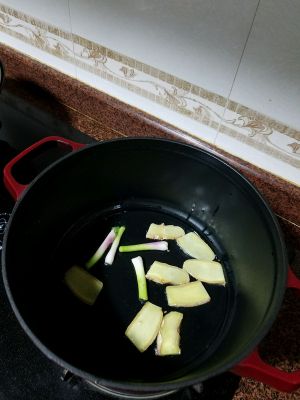 老姜切片 入锅,加一勺盐,开大火煮出血沫