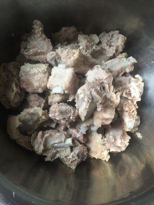 第一步,煮排骨。凉水,排骨,放电压力锅里,选择排骨。开始工作。这就不用管了。有喜欢吃有嚼劲的肉就减去几分钟,有喜欢吃脱骨软烂的排骨就加几分钟。根据做给谁吃决定软硬程度。我做给孩子和婆婆吃,婆婆牙口不太好。所以我加了两分钟。这其中有一个特别重要的细节,就是煮排骨,放清水。调料都不用放。排骨和水就行。水刚刚沫过排骨就行。不用太多。