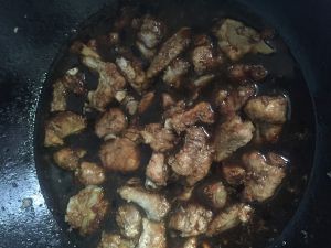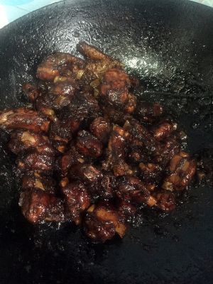 第七步,翻炒,排骨都上了黄色的嘎就行了。这时放入调好的汁。