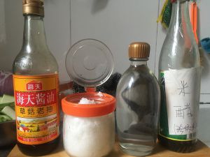 第五步,准备好糖,白酒,醋,草菇老抽。4勺糖 3勺醋 4勺草菇老抽 3勺白酒。这样的比例基本0失败。好吃,口味偏甜点。不是特别甜。大家可根据比例自己调喜欢的。