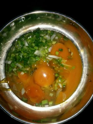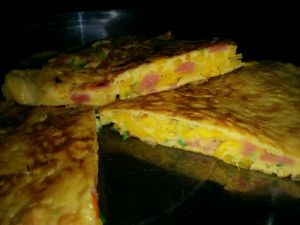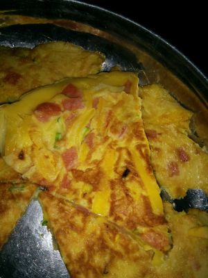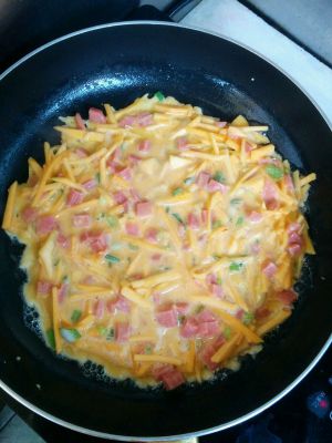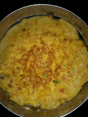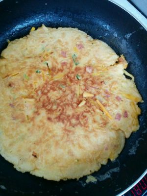 找一个平底锅,红太郎打灰太狼的那种,呵呵~热锅,放油,将搅拌好的材料倒入,记住不要忙于翻面