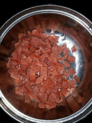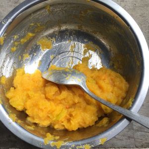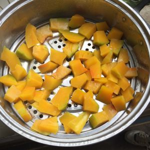 南瓜削皮去掉内部不要的部份,然后把南蒸熟,压成泥
