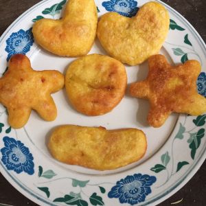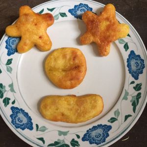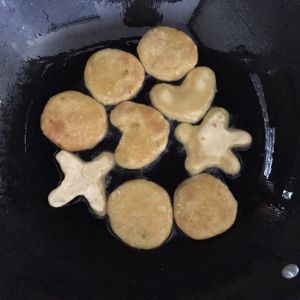 然后分成小面团,把豆沙陷包进去,按扁,放进油锅炸成金黄色就可以了