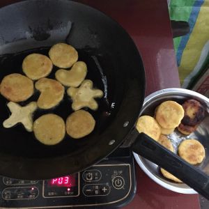 平底锅放油要比平时炒菜稍多一点,待油稍热后将成型的南瓜饼放入,煎至两面金黄即可。