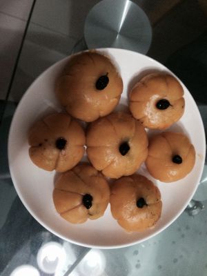最后将糯米团,搓成长条,切下一个个小锍子,再搓成碗形放入调好的黑芝麻,收口,搓圆,用调羹画一个个南瓜印,最后用葡萄干做瓜藤。(由于手上都是糯米粉没法拍制作过程,大家多包含啊)