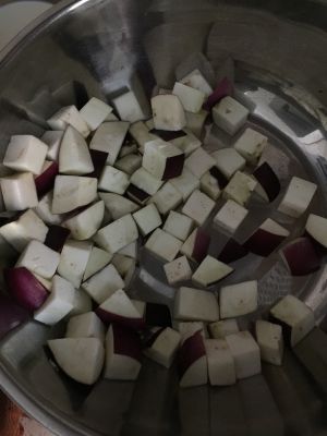 茄子去皮去蒂,切成1.5*1.5左右的小方块。浸泡在盐水中杀去水分。