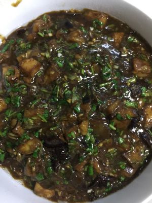 将葱姜大料下锅爆香,放入面酱炒香,放入茄子翻炒,加少许盐,糖,水,加入湿淀粉勾芡,放入蒜米,香菜,出锅。