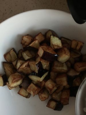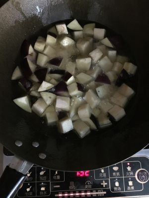 将杀去水分的茄子块沥干。锅内大量油,烧热至七八成熟,分批次下入茄子煸。煸至茄子块周围出现焦边就差不多了。