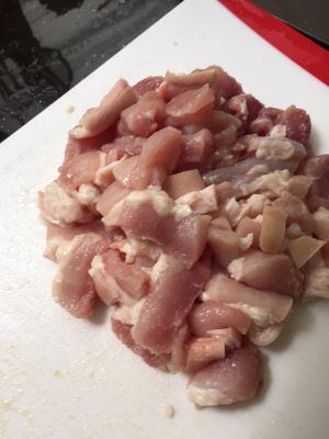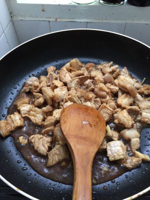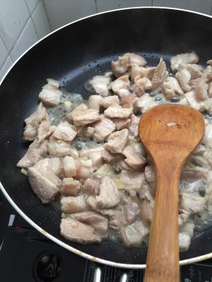 油热后,先下五花肉翻炒,等肉变白,下去蒜和姜继续翻炒!