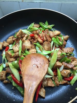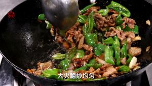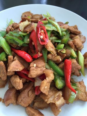 五花肉不出锅,即刻倒入切好的尖椒片和蒜片,放入盐(4g)、鸡精(4g),继续翻炒两三分钟。