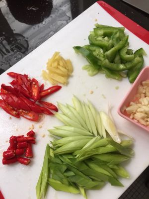 葱,红辣椒斜切,小尖椒切段,蒜剁碎,姜切丝,!