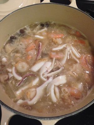 最后放入切好的鱿鱼,和大虾,五分钟即可~