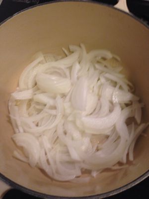放入洋葱翻炒至微微发黄后放入香菇继续翻炒一分钟后放水。水要多一些