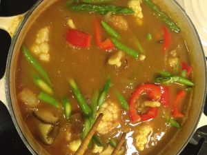 咖哩块儿充分融化后把蔬菜放进去继续搅拌大概五分钟后关火即可。