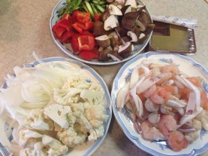香菇,红菜椒切块儿,菜花切块儿下开水焯一下,洋葱切丝,芦笋切段,虾仁,扇贝肉,鱿鱼放开水里焯一下,放料酒哦,去腥味。变色后捞出