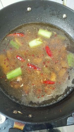 放入葱,姜,蒜,花椒,辣椒转大火炒香,加水前放入味极鲜酱油,