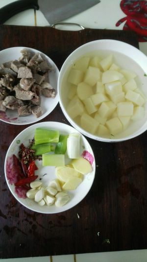 煮好牛肉捞出切块,土豆切块泡在清水里,水里放点盐料酒,这样烧出来的土豆香甜计较好吃。葱切段,姜切片,蒜切厚片