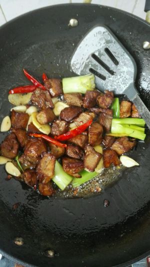 锅内放少许油,油温七成热时调小火放入蒜瓣,大葱段和姜片煸香,煸香后倒入洗干净的牛肉翻炒,加少许红烧酱油煸炒上色